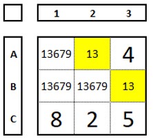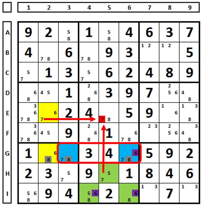 No Sudoku abaixo há dois comuns restritos (os números “7” e “9”). Um será solução em um ou em outro, com isto pode-se excluir o número “9” na célula G2, que enxerga os dois números “9” dos dois ALSs.