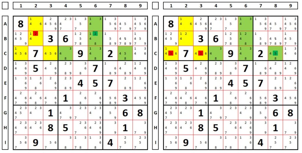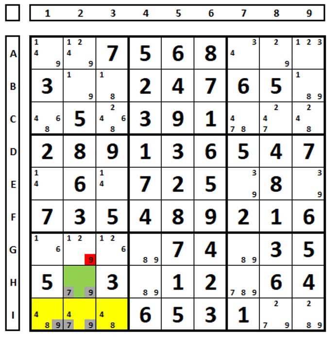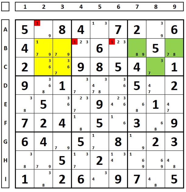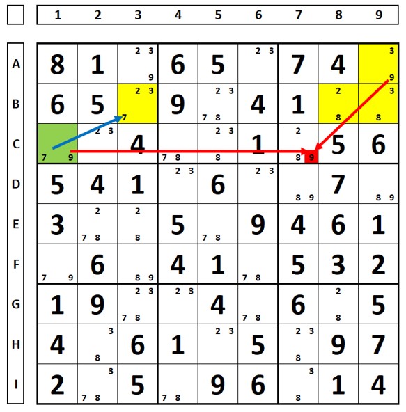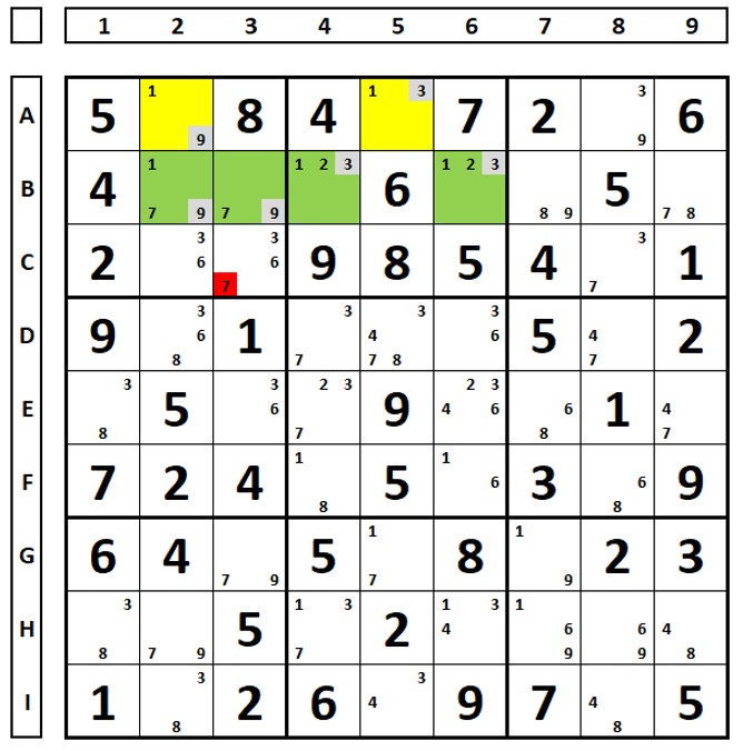 No sudoku abaixo há o ALS marcado em amarelo e o em verde. O número “7” é RCC em ambos. O número “9” da célula C7 enxerga todos os números “9” dos dois ALSs e pode ser excluído.