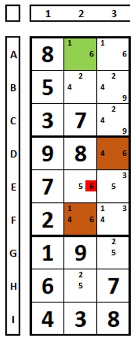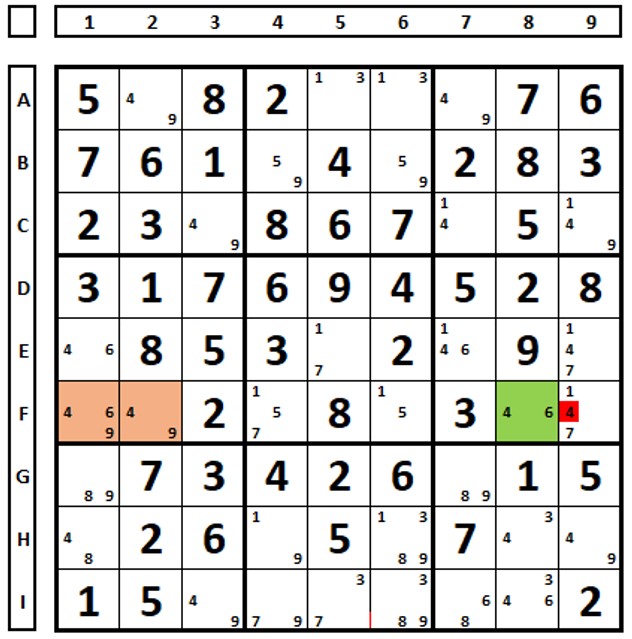Examine com cuidado a utilidade do Candidato Comum Restrito. No Sudoku abaixo, ou o número “1” é solução no ALS verde ou no ALS marrom. Se for no verde, exclui o número “1” em F2 e teremos um Par Bloqueado (Naked Pair) em D3/F2 (4,6), com isto o número “6“seria excluído em E2. Caso o número “1” fosse solução no ALS marrom, o número “1” seria excluído no ALS verde, restando o número “6” em A2, o que também excluiria o número “6” em E2.