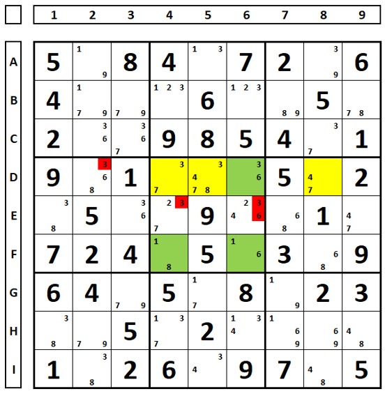 No sudoku abaixo são mostradas todas as regras de eliminação possíveis com o ALS de duplo vínculo. Os RCC comuns aos dois são os números “3” e “8”, com isto os números “3” nas células E4 e E6 podem ser excluídos pois enxergam os RCC dos dois ALSs. O número “3” da célula D2 pode ser excluído pois enxerga todos os números “3” dos dois ALSs. O número “6” na célula E6 pode ser excluído pois enxerga todos do ALSs verde.