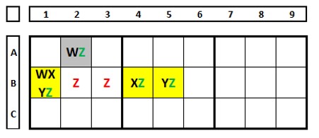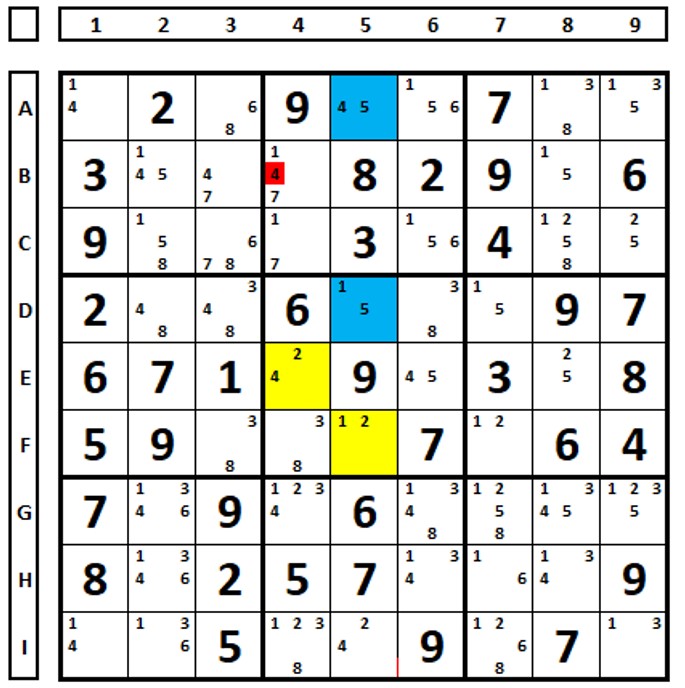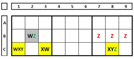 No Sudoku abaixo, na técnica XY-WING, qualquer escolha na célula em amarelo, leva ao número “5” na célula azul ou na verde, excluindo o número “5” na célula F9.