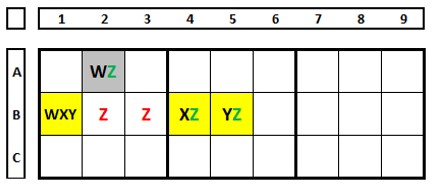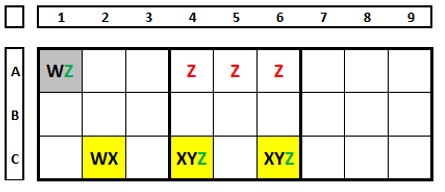 Na técnica ALS-XY-Wing há três ALS (verde, azul e amarelo). O número “6” em F6 é comum restrito com o mesmo número em D4. O número “7” em D4 é comum restrito com o mesmo número em D9. O número “5” em F9 pode ser excluído, pois enxerga ambos os números “5” na ponta da cadeia (células azul e verde).