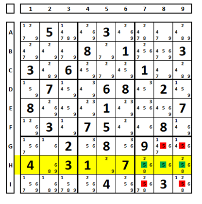 A number that is in three cells of the same row or column, within the same box, allowing its exclusion from cells that see them. In the example below, the number “5” is in row H in box 9, so it can be excluded in the positions marked in red: