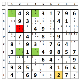 É “quase” um X-Wing. Os dois conjuntos de pares (A1/A4; F2/F4) compartilham a coluna 4 em comum. Qualquer escolha de solução em F2 ou F4 excluirá o número “2” em C2. Os “candidatos” que enxergam as duas pontas dos pares podem ser excluídos.