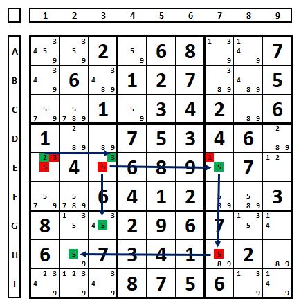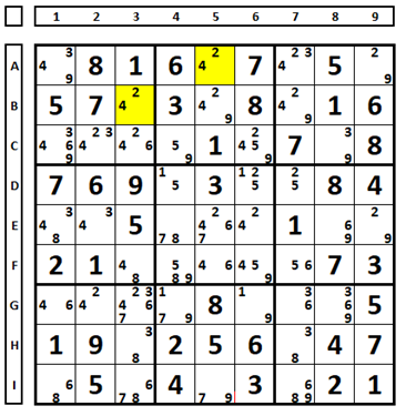 Usando a técnica de coloração para testes verdadeiro e falso. Na célula A5 do sudoku abaixo, o número “2” será a solução ou não desta célula. Examinar as duas situações, usando a cor “verde” para verdadeiro e “vermelho” para falso.