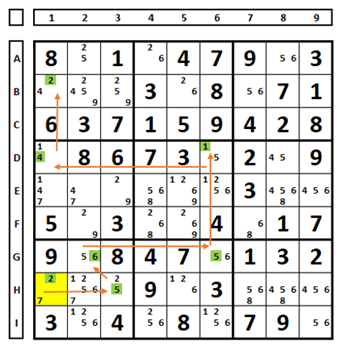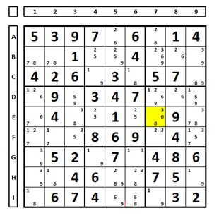 Testando uma célula com três números possíveis. No Sudoku abaixo há três candidatos na célula E7 (números 3, 6 e 8). Examinado o que ocorre considerando cada qual solução do Sudoku: