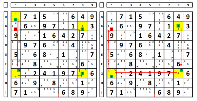 Forcing chains testa o que ocorre em outras células quando escolhe-se um número ou outro como solução do Sudoku na célula em teste. Nas células alvo pode-se encontrar números que são solução do Sudoku e números que podem ser excluídos. Alguns autores chamam uma regra derivada de “The Dual Forcing Chain” (A corrente de força dupla), que é semelhante, apenas opera com um par bloqueado onde as extremidades enxergam duas célula bi-valor, com o mesmo par de números. No Sudoku parcial abaixo, qualquer escolha na célula A1 força a eliminação do número “A” em C1.