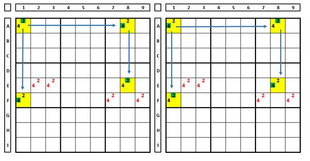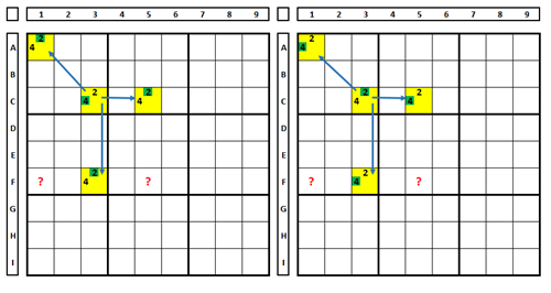 Em resumo, nesta técnica (cadeia XY-RP) é necessário um número par de células bi-valor (no primeiro exemplo, 4 células, no segundo 6 células), para que os números inicial e final da cadeia sejam antagônicos.