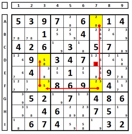 No Sudoku abaixo, qualquer escolha (2 ou 8) na célula A7 irá excluir o número “8” na célula D7. Idem iniciando para a célula D3.
