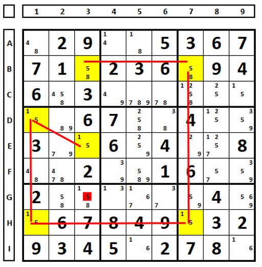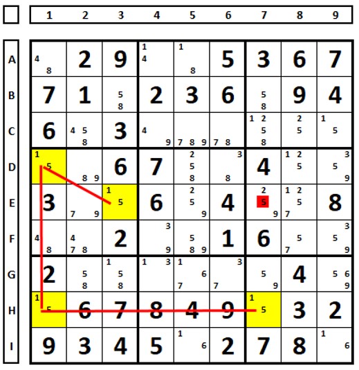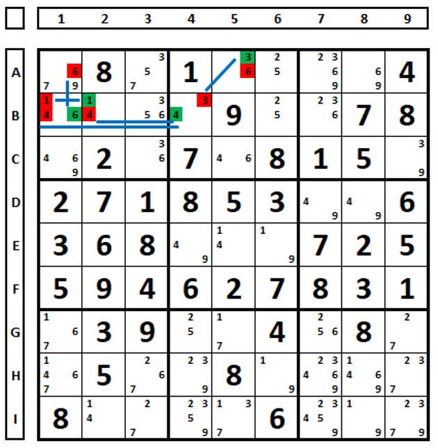 No sudoku abaixo, qualquer escolha na célula A5 irá excluir o número “6” na célula A1. Ao escolher o número “3” houve esta exclusão, ao se escolher o número “6” haveria a mesma exclusão. Um alerta, não se sabe, neste momento, se na célula A5 o número “3” ou o “6” é solução para este sudoku.